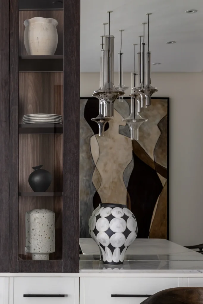 All furniture and bespoke built-in elements were custom designed by Anu and her team to optimise the apartment’s smaller footprint, ensuring every space feels considered, efficient and elegant. Clean architectural lines are complemented by tailored storage solutions, while upgraded flooring and ceiling treatments enhance continuity throughout the home.