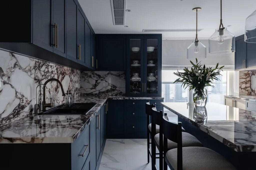 The space features a palette of soft neutrals, custom furnishings and carefully curated art to create a harmonious and welcoming atmosphere. Thoughtful design details, from bespoke cabinetry to elegant lighting reflect the client’s lifestyle and highlight the panoramic marina views. The result is a sophisticated stylish home that balances contemporary elegance with everyday comfort.