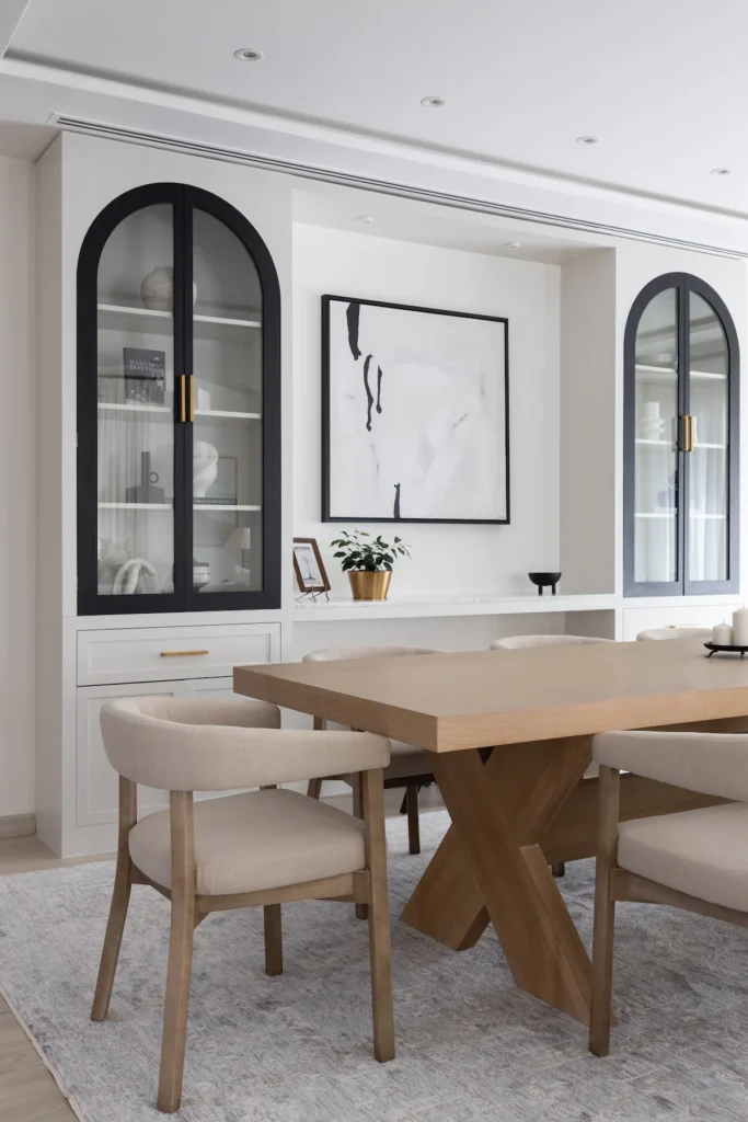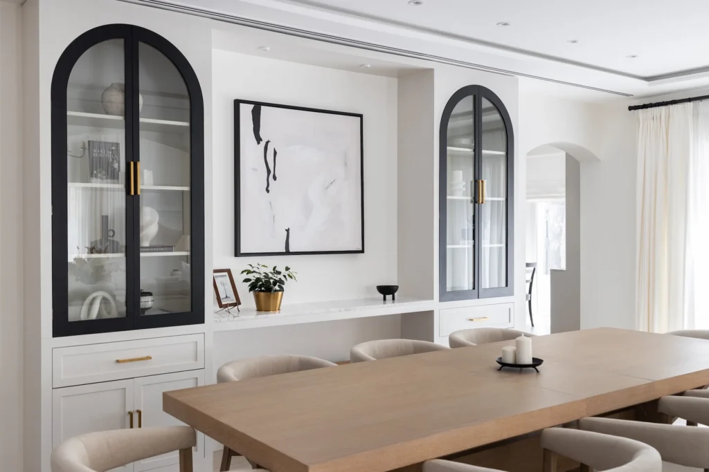 So even within the theme, there is the ability to bring in different influences. The ground floor breakfast area has a modern farmhouse vibe, where the arched cabinetry with black and brass detailing brings Spanish architecture to mind. For a large family, its these communal spaces where memories are made and meals are shared.